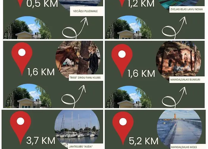 A szállás 4 km-re helyezkedik el a Mangalsala pier területétől és hozzávetőlegesen 6 km távolságra van az Ozo Golf Club térségétől. A Daugavgrivas cietoksnis a villa szomszédságában van.
